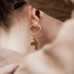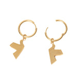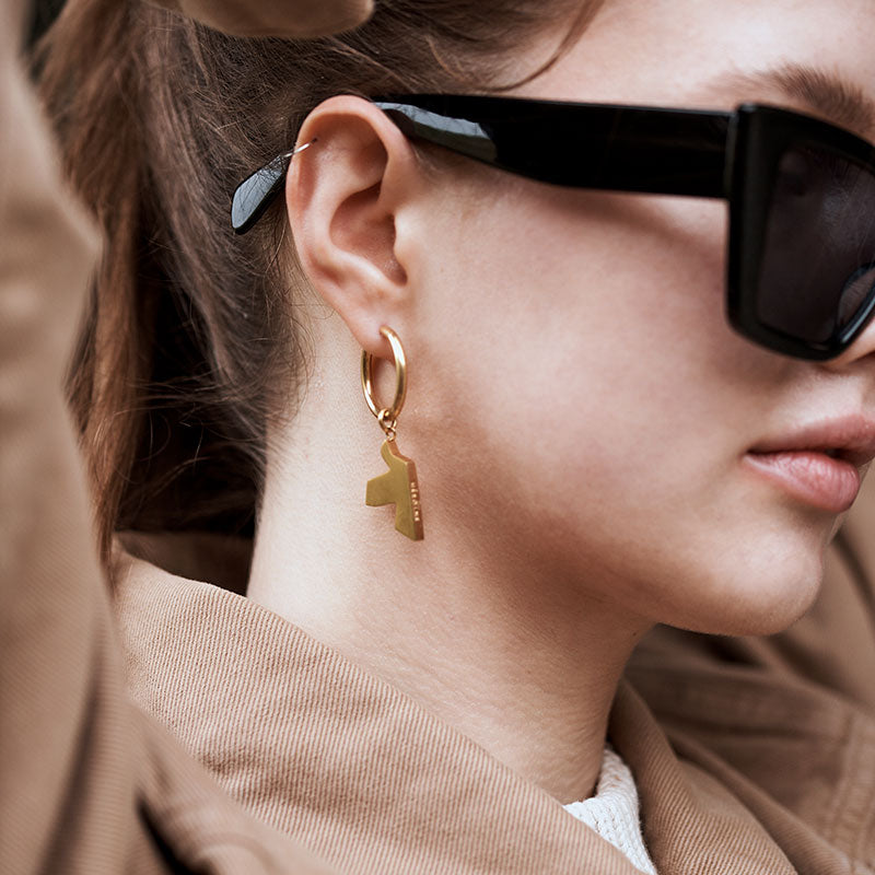 Goldene, glattgebürstete Ohrringe mit Vogelanhänger und seitlich eingraviertem Hēroïne-Logo. Der Ring lässt sich zum Öffnen auseinanderklappen und mit einem Klick verschließen.
